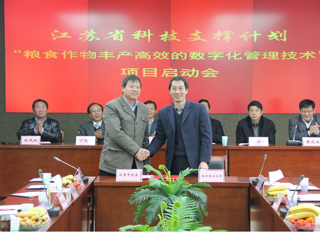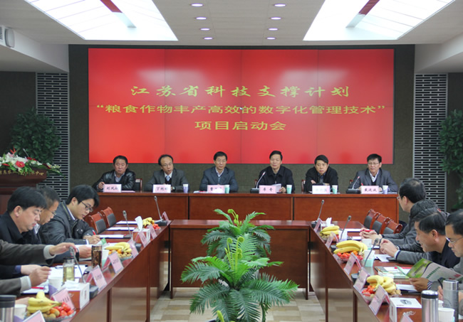 11月24日,由中心承担的江苏省科技支撑计划“粮食作物丰产高效的数字化管理技术”重大项目启动会暨2012年度工作部署会在南京农业大学召开。省科技厅副厅长李奇、副校长丁艳锋、中心主任曹卫星教授,省科技厅农村处、校科研院相关领导及省农委作栽站等全省17个项目合作单位共计50余人参加了会议。会议由农学院常务副院长戴廷波教授主持。