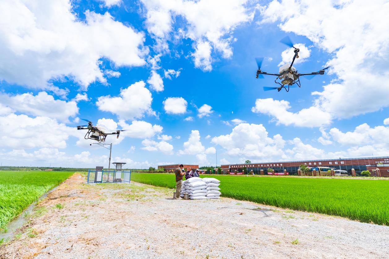 7月22日,在上海市光明农发长江农场前进六区的稻田上空,消费级无人机轻盈掠过,快速捕捉着水稻长势信息,根据苗情生成的变量施肥处方图即时发送给大载重植保无人机,收到指令的两架植保无人机腾空飞起,在绿浪翻滚的稻田间精准穿梭,将科技的力量均匀播撒——这是水稻无人机智慧施肥技术现场观摩活动上的生动一幕。